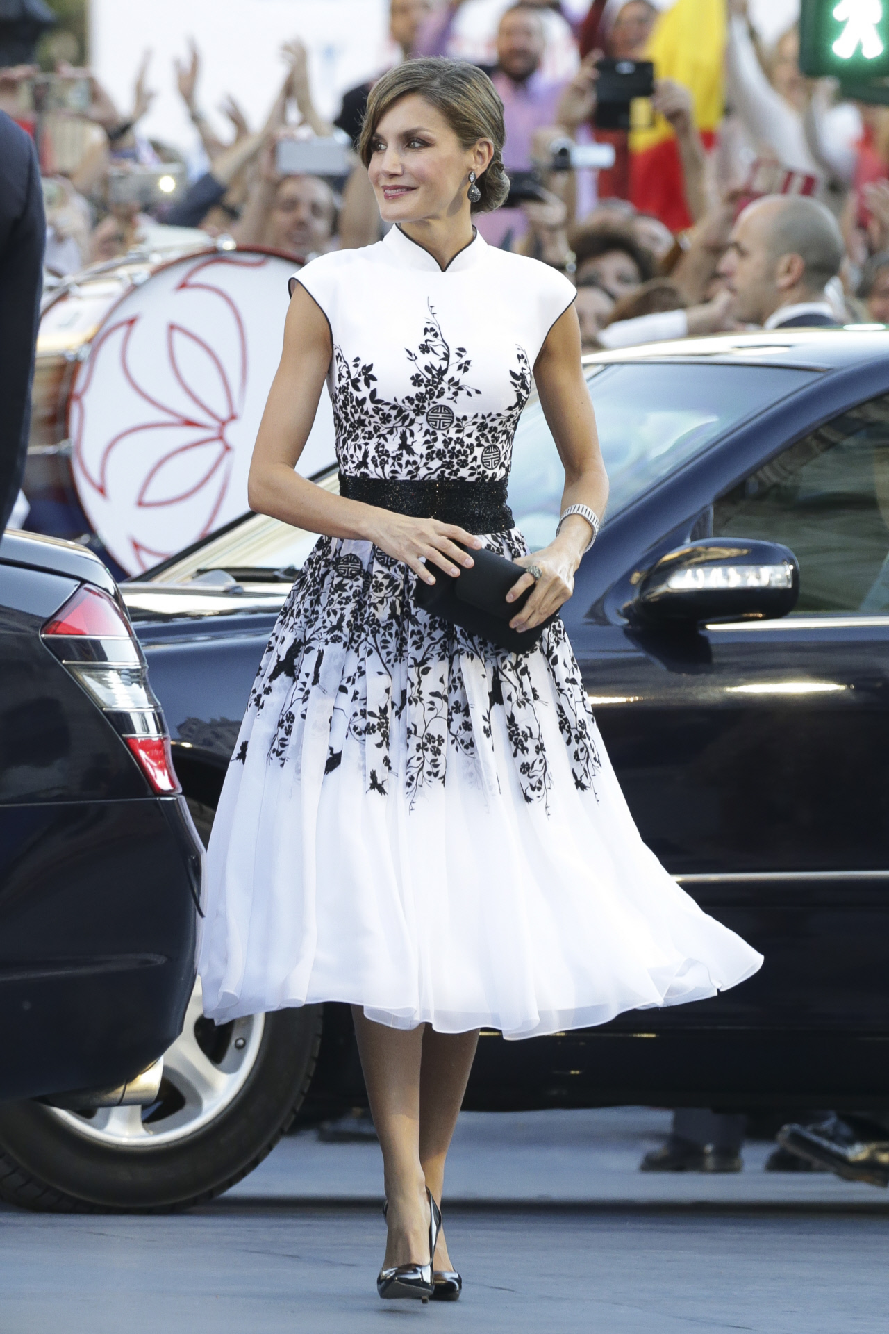 Uno de los Varela más bonitos y recordados de la reina es este blanco de inspiración asiática que estrenó en los Premios Princesa de Asturias de 2017. Foto: Gtres