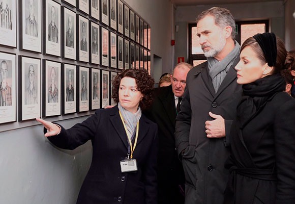 Se trata de la primera visita de los reyes de España a un campo de concentración. Un acto solemne y lleno de tristeza en el que Felipe VI y doña Letizia escucharon emocionados los testimonios de algunos de los supervivientes de la barbarie, desde la Puerta de la Muerte.