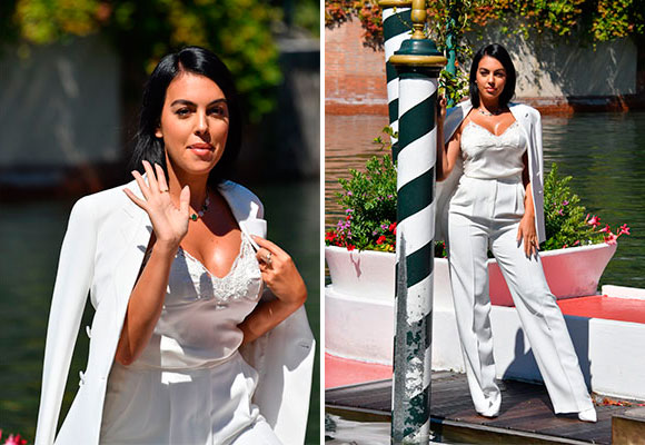 Georgina Rodríguez llegaba a Venecia con un traje de chaqueta blanco