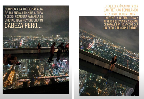 Por cierto, lo más destacado de sus últimas publicaciones lo hemos visto en sus stories. Se trata de un pequeño inconveniente vivido en lo alto de una de las torres más altas de Bangkok. A 714 metros de altura se encuentra una pasarela de cristal sobre la que se quedó literalmente clavada por el miedo. Tal y como ella misma relata, tuvieron que ayudarla a salir de allí debido al intenso pavor que sintió.