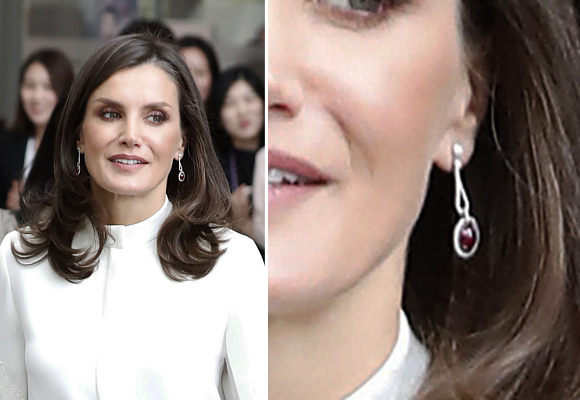 Un atuendo que la reina Letizia ha mejorado con los complementos; entre ellos unos pendientes de la joyería Aldao que ya lució anteriormente en otros eventos públicos y que están realizados en oro blanco con diamantes y rubíes engarzados.