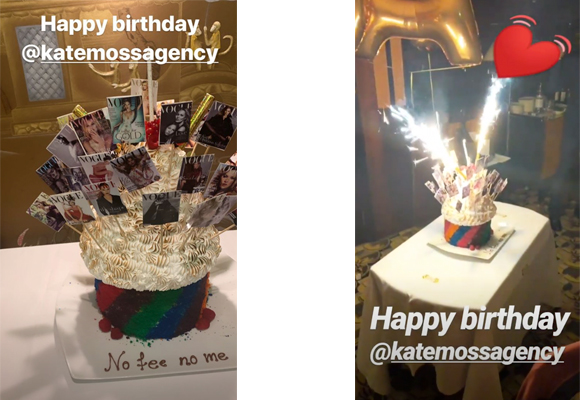 Todos los invitados mostraron un humor excelente desde el principio, cuando se sirvieron unos aperitivos y las primeras copas. Durante toda la cena todos fueron fotografiándose mutuamente y colgando fotos en la Red con dedicatorias de lo más afectuosas. Aunque la cena, dicen, fue exquisita, el pastel superó todas las expectativas. Tenía forma de un enorme arco iris sobre base de merengue que llevaba encima un lema, ‘No Fee No Me’, de delicada traducción, algo así entre “no tengo precio” o “sin precio no me tienes”. Kate se emocionó cuando lo descubrió tapado con docenas de portadas de Vogue que reflejaban su exitosa carrera en el mundo de la moda.