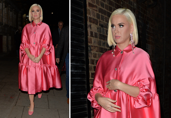 Su llegada al teatro Shaftesbury, en el West End de Londres, no pasó desapercibida porque la cantante escogió un brillante abrigo en satén rosa que iluminaba media calle. Puro estilo años setenta con profusión además de brillantes y perlas colgados de las orejas.