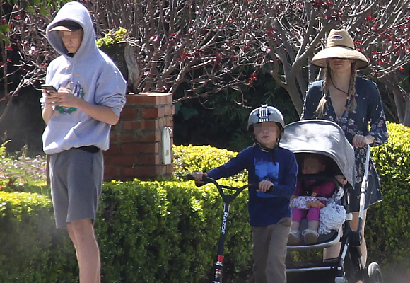 Mantener a los niños encerrados en casa durante 24 horas es una difícil tarea. Kate Hudson lo demostraba en estas últimas horas saliendo a pasear con sus tres hijos. Ataviada con un vestido primaveral y un sombrero de paja calado hasta media cara, disfrutaba del aire libre acompañada de Ryder Robinson, de 16 años, constantemente pendiente de su teléfono móvil; Bingham, de ocho años, con casco y patinete; y Rani Rose la pequeña de un año, sentada en su carrito.