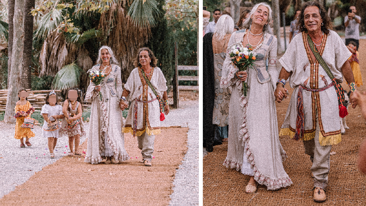 Seis hijos y tres nietos después, Merel y Alok, la pareja de diseñadores que creó hace dos décadas la firma internacional World Family Ibiza, acaban de renovar su amor. Pareja se dio el “sí quiero”, el pasado lunes 13 de septiembre, al amparo del atardecer, rodeados de amigos, de familia, de animales y en plena naturaleza ibicenca. La fecha escogida respondía a su 25 aniversario, en la que reafirmaron su amor en la boda más mágica y bohemia de Ibiza.
