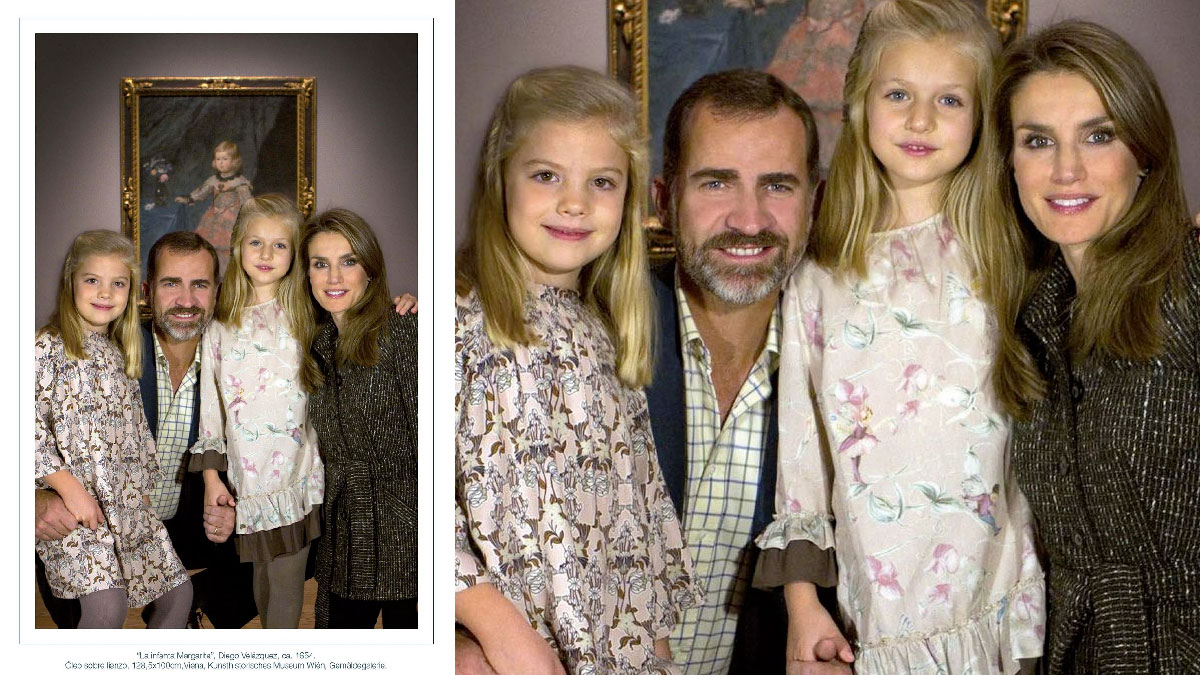 Quizás la de 2012 sea una de las felicitaciones navideñas más originales de la Familia Real. Se trata de una fotografía de los Príncipes de Asturias y sus hijas tomada en el Museo del Prado frente al cuadro de la Infanta Margarita con motivo de la exposición ‘Velázquez y la familia de Felipe IV’.