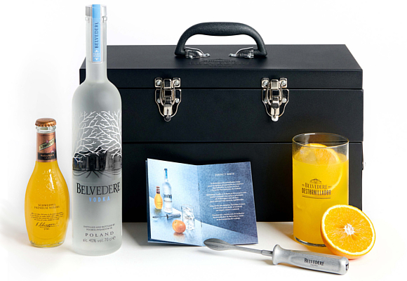 El pack navideño que nos propone Belvedere para estas fiestas consiste en una elegante caja de herramientas metálica y de color negro, en la que se incluye una botella del famoso vodka junto a dos botellas de mixer premium de naranja, dos vasos personalizados con el logotipo y un práctico destornillador, que servirá para extraer unas gotas de jugo a naranjas, limas o pomelos.