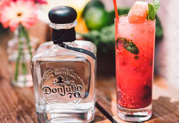 Ingredientes: 4 cl. de Don Julio 70, 0.9 cl. de zumo de limón, 0.9 cl. de almíbar Orgeat (es un jarabe elaborado a partir de almendras, azúcar y agua de rosas o de azahar), 2 rodajas de sandía, 2 frambuesas, 5 ramas de menta y sal de Chile.