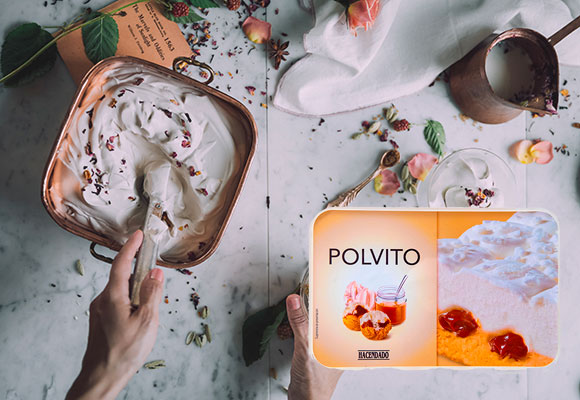 Esta nueva gama de helado de la marca Hacendado está inspirada en el postre tradicional canario polvito uruguayo, un plato compuesto por galletas, dulce de leche y nata, en el cual los ingredientes aparecen triturados como el polvo. De ahí que le llamen polvito.