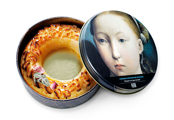 La pastelería oscense ha trasladado su obrador a la época renacentista y ha sumado sinergias con el Museo Thyssen Bornemisza hasta crear un postre nuevo inspirado en uno de los cuadros de la Colección Thyssen de Madrid. Se trata del ‘Retrato de una infanta, Catalina de Aragón’ de Juan de Flandes, que se transforma estas fechas en una corona de mazapán y agua de rosas.