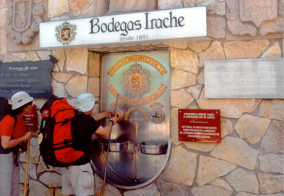 Aquí en España, Bodegas Irache ha construido en uno de sus muros que da al Camino de Santiago una fuente de vino para invitar al peregrino a un trago reconstituyente. Este rincón ya era conocido en el siglo XII como “Tierra de buen pan y óptimo vino”, según consta en el Codice Calixtino. Aparece como punto de interés en muchas guías y en cientos de referencias en Internet.