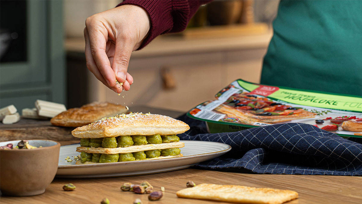Y para montar las milhojas, coloca una base de hojaldre, rellena con la crema de pistacho con la forma que más te guste (a tiras, a copos…), coloca la otra base encima y rellena de nuevo. Por último, pon el hojaldre que espolvoreaste con azúcar como tapa. Y voilà.