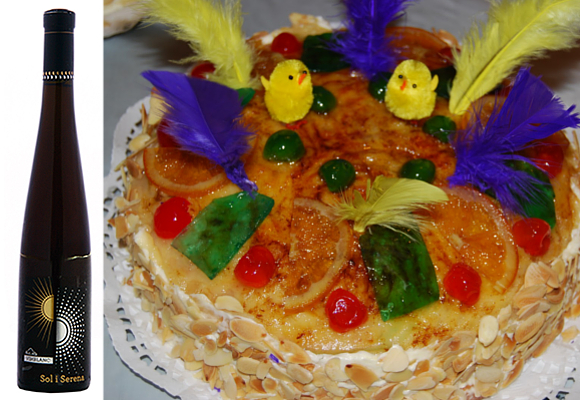 Como todas las recetas del mundo, la mona tiene variantes y versiones. Ésta es una de ellas en formato tarta: con frutas escarchadas, yema y almendra. Para acompañarla nos trasladamos a Vinebre, una pequeña población de Ribera d’Ebre en Tarragona. En Molí de Rué se elabora este especialísimo vino dulce, el Vimblanc Sol i Serena, un macabeu que encierra secretos ancestrales en su elaboración. Una joya para descubrir de limitadísima producción cuya acidez y equilibrado dulzor encaja con las frutas escarchadas y su marcado tostado con los frutos secos.