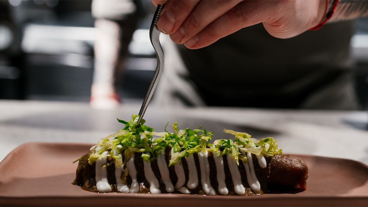 La experiencia sigue con dos platos más tradicionales, Sope, con trompeta de la muerte y huitlacoche; y Gaonera, unos tacos de rib eye a la brasa con lima. Y por último, rematar con el postre.