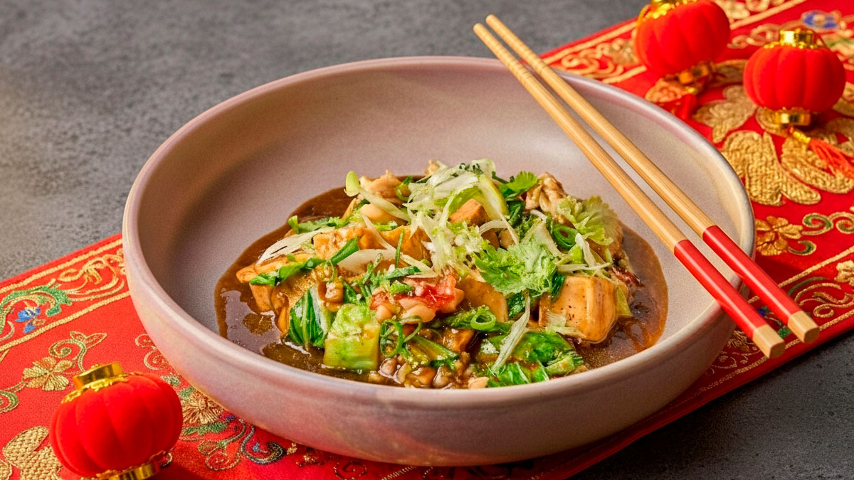 El recorrido comenzará con un taco fresco relleno de langostinos en tempura y encurtidos seguido de un dumpling de pollo pepitoria. El menú continuará con un wok de pollo con salsa de ostras y verduritas chinas (en portada). Un plato que evoca la cocina doméstica y el simbolismo de los salteados como representación de abundancia y equilibrio.