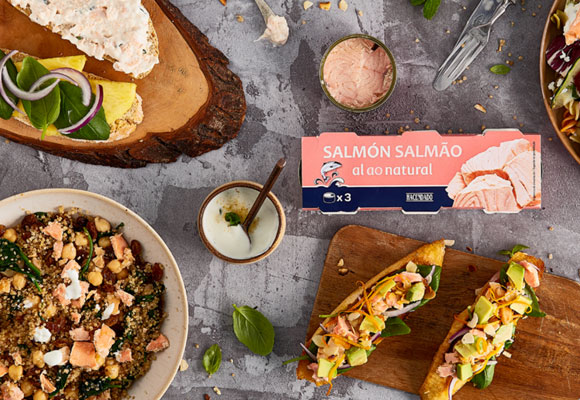 Recetas para disfrutar del salmón al natural hay multitud. Pero desde aquí te proponemos cuatro sugerencias que nos han gustado especialmente y que podrás conocer en detalle en el enlace adjunto. Prueba a combinarlo con aguacate y naranja en una bruschetta deliciosa o en una ensalada de quinoa y garbanzos repleta de sabor y muy sana.