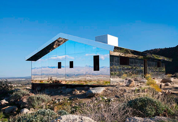 Son ocho, y su principal característica es la de integrarse en el medio que los rodean mediante espejos que reflejan el entorno, de esta forma escapan a la percepción directa (fantástico). El primer edificio que os mostramos está diseñado por el artista americano Doug Aitken. Se trata de un pabellón temporal en forma de rancho tradicional del Oeste americano de los años 20 y 30 del pasado siglo. Es un racho cubierto de espejos (brutal), una escultura que se instaló en el desierto de California (2017) y cuyo éxito ha hecho que se vaya a instalar también en las montañas cubiertas de nieve de Gstaad, Suiza (podrás visitarlo hasta el 2021).