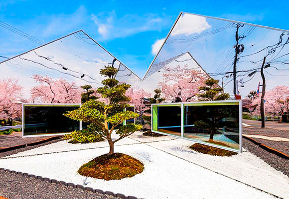 De las montañas de Suiza y Estados Unidos saltamos al confortable y siempre amable Japón, donde el estudio de arquitectura Bandesign nos ha deleitado con una atrevida cafetería en la Prefectura de Gifu. El edificio, de casi 100 metros cuadrados de superficie, está ejecutado con dos de sus fachadas enfrentadas en un ángulo de 90 grados, posibilitando que en ese espacio pueda crecer un cerezo. Al cubrir estas dos fachadas con espejos, los diseñadores permiten que visualmente haya tres cerezos que, destacan sobre el fondo boscoso y un lecho de grava blanca.