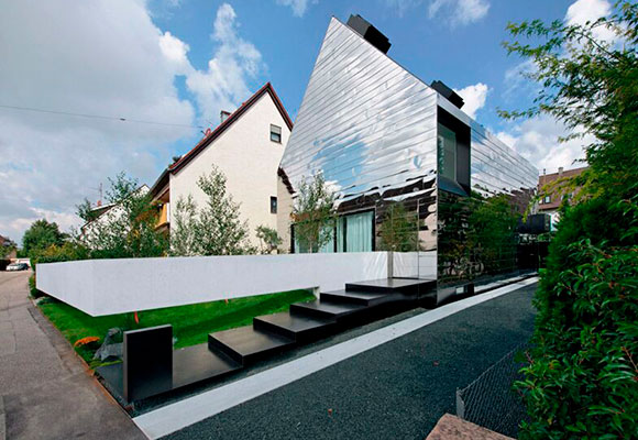 Rizando el rizo, es decir, utilizando espejos no para reflejar, sino para distinguirse, el alemán Bernd Zimmermann decidió revestir de paneles reflectantes una edificación de los años 50. La vivienda lleva el nombre de House WZ2 y está en Ludwigsburg, cerca de Stuttgart. La envolvente, en este caso, está ejecutada con paneles de acero inoxidable colocados a forma de ladrillos, hasta en la cubierta a dos aguas, de esta forma, trata de mimetizar el entorno construido, al mismo tiempo que lo distorsiona. En fin, para quitarse el sombrero.
