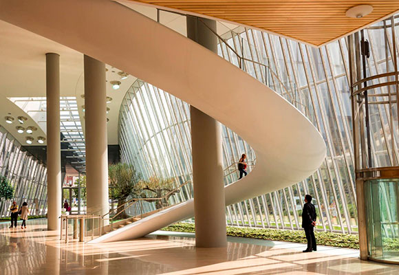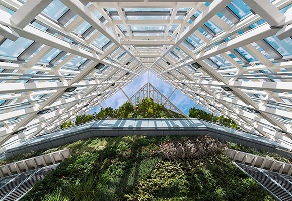 El inmueble se inauguró en el año 2009 y, además del inusual jardín vertical interior, el edificio ofrece un gimnasio en la planta 19, unos 600 metros cuadrados de salas de reuniones para los usuarios y, lo mejor, dos restaurantes (la comida siempre es importante). Los 44.000 metros cuadrados de superficie acristalada de la fachada conforman la cara exterior de un muro cortina doble, cuya ventilación de alto rendimiento favorece la alta eficiencia energética, llegando a la certificación con letra A, es decir, la mejor posible.