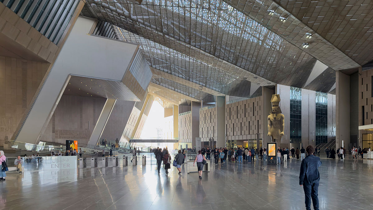 El tributo, tanto en los jardines como en el edificio, se gesta a través de una figura geométrica concreta, el triángulo. Desde el aire, un despliegue de muros en forma de abanico dirige sus vistas hacia las pirámides de Guiza. Mientras que dentro, una parte importante del inmueble se ha ejecutado bajo suelo para salvaguardar mejor muchísimas e invalorables piezas históricas de arte egipcio.