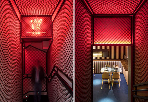 Conectando las dos plantas del negocio hay una escalera vibrantemente roja, capaz de deslumbrar por su mera existencia, con una trama que recuerda a las redes de los pescadores.