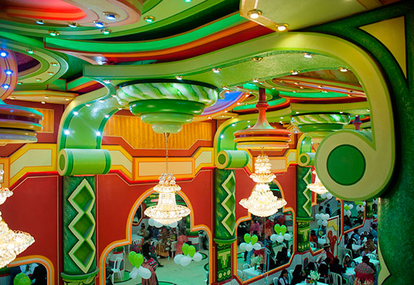 El uso de grandes candelabros en los salones interiores, junto a la aplicación de capiteles en las columnas, realzan la utilización de colores y formas atrevidas, que se iluminan con 2.000 o 3.000 bombillas. Las rotundas formas del interior las ejecutan artesanos del lugar, que las moldean siguiendo técnicas profesionales. Además, aplican las pinturas con pinceles, nada de brocha gorda.