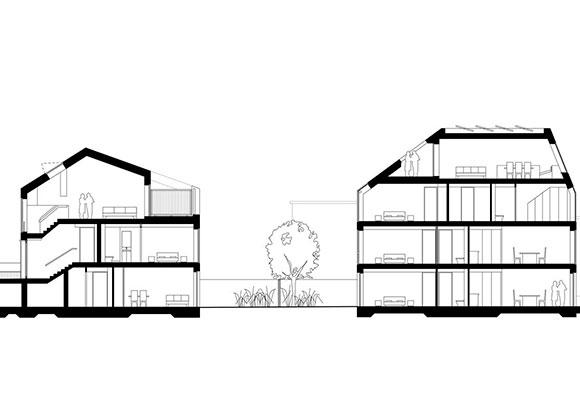 Estos huecos, resueltos con un sencillo marco de tono negro, no sólo mitigan la sensación de asfixia, también dan identidad al proyecto al doblarse en las líneas de los edificios, siguiendo las inclinaciones de los aleros.