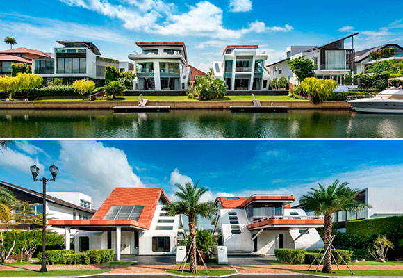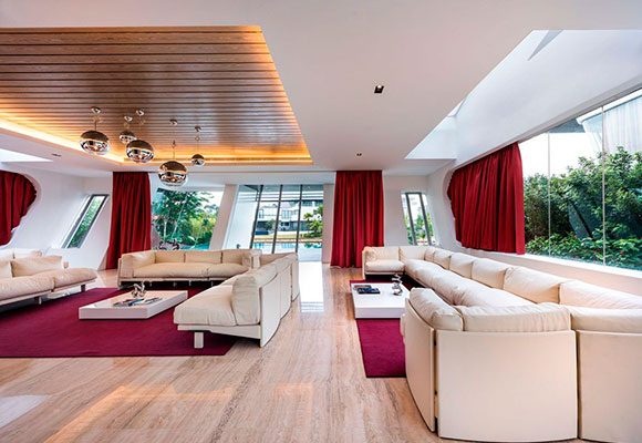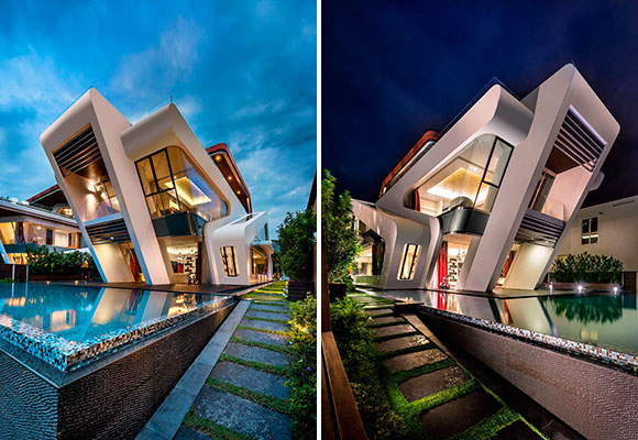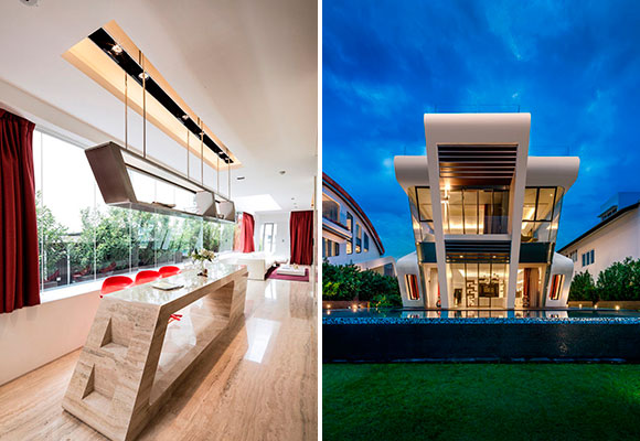 La villa ganó el pasado 2019 el premio a la mejor residencia construida de los prestigiosos World Design Awards, un galardón que luce en su pecho gracias al atrevido diseño, que se inspira en el viento que da nombre al edificio, y que se sustenta en la comparación idílica entre el hogar y un elegante crucero. También destaca la forma inclinada de las fachadas, forzando los ángulos verticales, para que se parezcan a los costados de un barco, un barco varado en el océano índico, y más concretamente, en la isla de Sentosa, Singapur.