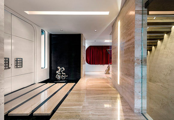 El mármol travertino es el nexo común entre lo vertical y lo horizontal dentro del edificio. Se trata de un material resolutivo, duradero y eminentemente orgánico, gracias a sus “aguas” interiores, unas vetas de distintas graduaciones que hacen imposible la repetición de patrones.