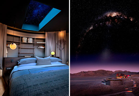 Cada suite posee piscina, aire acondicionado, sala de estar con chimenea, un dormitorio de quitar la respiración, que incluye una enorme claraboya sobre la cama; y un baño con vistas al desierto, para que no te pierdas ni un minuto del mágico espectáculo. Todo esto con un exquisito diseño obra del estudio con base en Sudáfrica Fox Browne, y, en concreto, con el arquitecto Jack Alexander, quién se encargó de los detalles más técnicos.