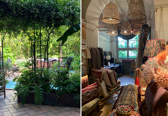 Sofas, lounge chairs, antique daybeds, chairs and banquettes all upholstered with her own creations or vintage textiles exuberate warmth and comfort, and add to the magical feeling. Vintage Suzanis, antique rugs, ethnic fabrics, oriental and ottoman porcelain, objects globally sourced and patterned lampshades, add another rich layer to complete that look that just leaves you breathless. The view from the living room: an outdoor terrace, or more likely an oasis of orange trees, jasmine, and other plants and flowers completed with a small pool.