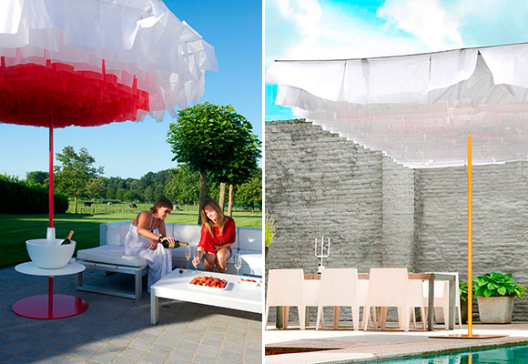 Si lo que quieres es una sombrilla para tu piscina particular, te recomendamos que optes por diseños diferentes y llamativos que combinen con el resto de decoración que tienes en el jardín. En KSL Living disponen de un espectacular diseño, formado por pequeños trozos de tela que caen de forma vertical, en tonos blancos y rojos, dejando una estética similar a la de una rosa.