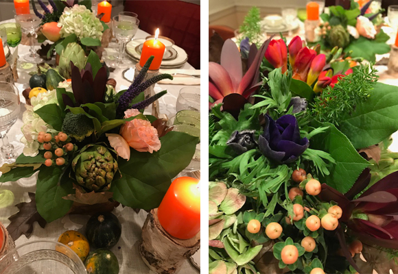 Junto a estas flores con una paleta cromática tan cálida, contrastamos, pero siempre en un segundo plano, leucadendros, verónicas, anémonas, hipérico y ornitogalum. Por último, la alcachofa y la calabaza destacan por la parte de los vegetales y junto a ellas, las peras, kakis, espárragos, castañas.