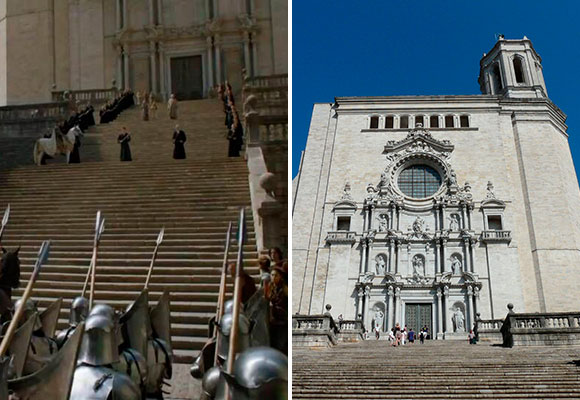En la calle Bisbe Josep Cartaña, muy cerca de la catedral, se encuentran las escaleras donde Arya ve a la niña abandonada y donde se sienta cuando se queda ciega. Otros lugares de interés son La Plaça dels Jurats, donde Arya ve la obra de teatro, o la mítica escena donde la reina Margaery realiza el camino de la vergüenza desde el Gran Septo de Baelor. Esta fue rodada en las escaleras y la fachada de la catedral de Girona. A raíz del éxito de Juego de tronos, las ciudades de Sevilla y Girona han sabido explotar este fenómeno fan y han creado varios tours turísticos en los que se pueden visitar las localizaciones del rodaje de la serie.