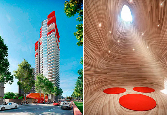 Balcones blancos rodean todo en perímetro del edificio de forma curva, sensual, y acentuada con los tonos rojizos de algunos balcones en lo alto y el gran lobby abierto al exterior. Cada vivienda posee espectaculares carpinterías de cristal de piso a techo, terrazas de distintas dimensiones, domótica de última generación, pavimentos con madera de bambú, y espacios abiertos en el interior. Como detalles de lujo comprometido, salas para practicar yoga con forma de capullo, y los jardines verticales de la planta baja, donde el lobby de tres alturas.
