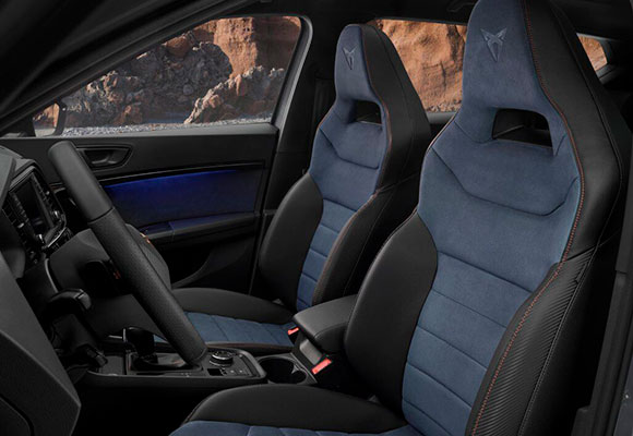 Los asientos delanteros del nuevo CUPRA son de tipo bucket, con tapicería en tejido Alcántara de color azul petrol