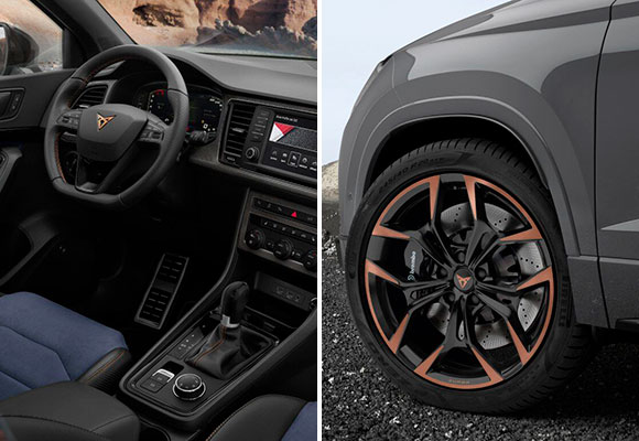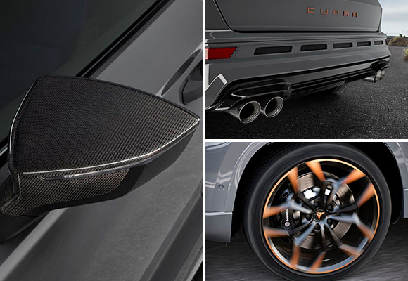 Tanto el alerón del techo como las carcasas de los retrovisores son de fibra de carbono e incorporan detalles también de color Copper; un material de diseño artesanal y exclusivo para esta versión Limited Edition, que define a este SUV y subraya el ADN CUPRA. La carrocería se presenta con la exclusiva pintura Gris Graphene, solo disponible en esta edición especial. Esta versión añade además unas nuevas y exclusivas llantas de aleación en color negro y cobre de 51 cm (20 pulgadas), con un buje de mayor tamaño que amplía la anchura de vías, aumentando así la estabilidad en curva, y en su interior destacan los frenos firmados por Brembo con discos delanteros de 46 cm (18”).