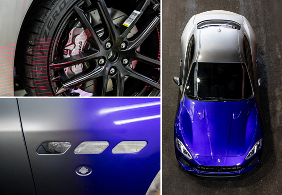 Mirando el vehículo desde la parte trasera hacia la delantera, las superficies experimentan una mutación y se enriquecen al pasar de un efecto satinado claro a un color metálico bruñido. La parte central se transforma haciéndose más profunda y llegando al azul Maserati que evoluciona y se hace más energético, eléctrico, casi vivo, como si fuese un espejo.