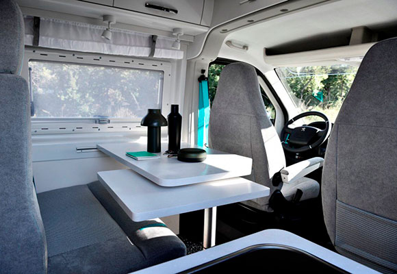 Se han creado 4 zonas diferenciadas: cocina-comedor, dormitorio, cuarto de baño y puesto de conducción. La transformación es obra de Bravia Mobil y los equipos de Colores y Materiales de Peugeot. El fregadero, la encimera y la mesa son obra de Kerrock, mientras que Alpine, especialista en dispositivos multimedia para el automóvil, se ha ocupado del sistema de información y entretenimiento y del navegador.