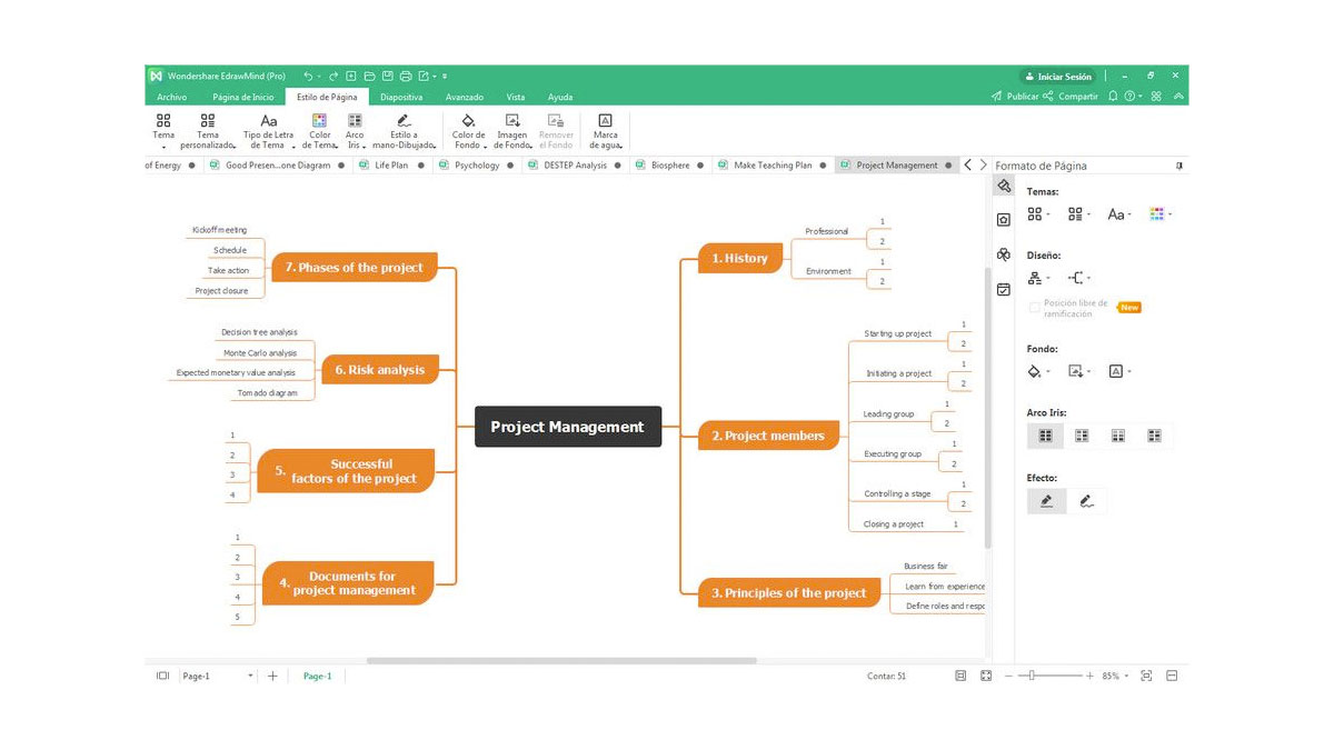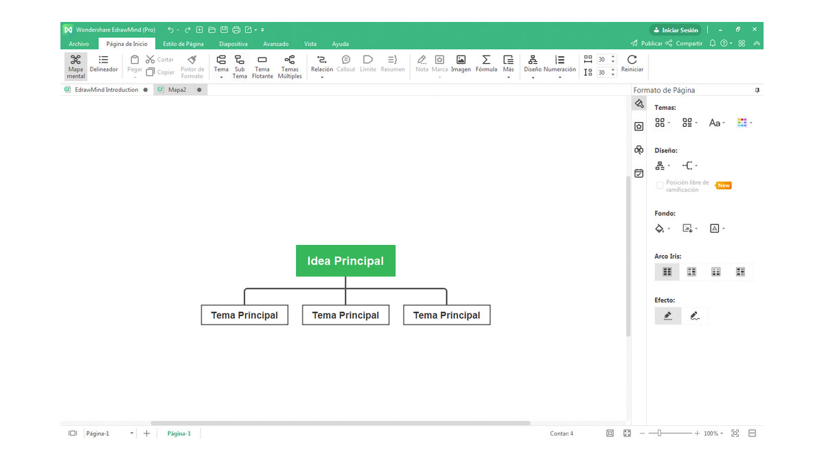 Para personalizar el diseño y otros aspectos del mapa mental ve al apartado de Formato de Página. A tu disposición tienes varias plantillas que incluso pueden utilizarse en ámbitos profesionales, ofreciendo todas ellas un muy buen resultado. Las más utilizadas son las educativas, ideales para exámenes.