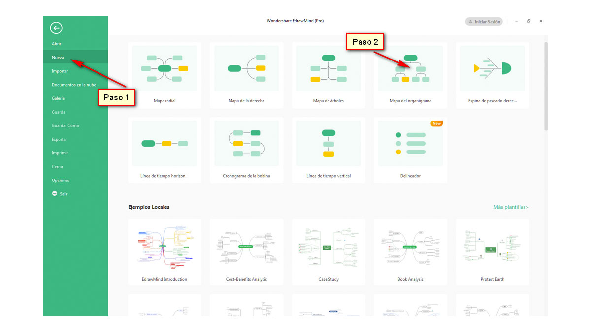 Pulsa el botón ‘Nuevo’ para acceder a una amplia lista de plantillas. Las que están disponibles son muy variadas. Dependiendo del resultado que pretendas obtener, deberás optar por unas u otras. Hay varios tipos de mapas: sectores, línea temporal, radial, árbol, etcétera. Gracias a ello puedes dar forma a cualquier tipo de conjunto que se te pase por la cabeza, ejemplificándolo un mapa mental para resumen que es ideal para los exámenes.