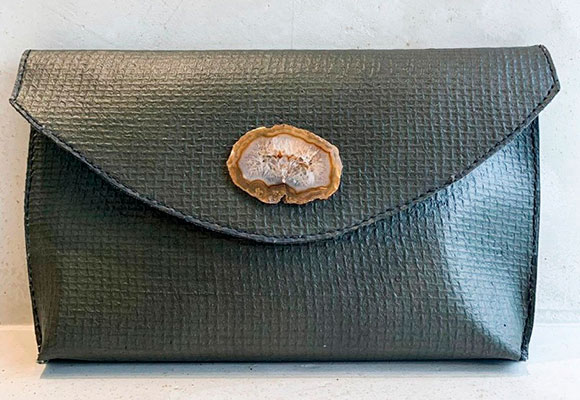 “El bolso se compone de un tipo de cemento que está mezclado con resina en base de agua, lo que hace que éste solo tenga partículas de cemento que no le aportan peso. De hecho, pesa como si fuera un bolso de cuero o de piel”, explica Carolina. Además, en su parte central se ha colocado un broche de ágatas y esmeraldas, aportando un toque de brillo y distinción a la pieza.