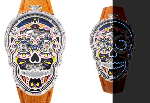 Este reloj de Fiona Krüger se inspira en la peculiar manera que tienen en México de celebrar el Día de Muertos con la calavera como motivo principal. De hecho, esta figura es la más habitual en los especialísimos diseños de esta relojera independiente de origen escocés. En este caso, se trata de una edición limitada de 18 piezas en las que a través de los ojos de la calavera puede apreciarse el movimiento esqueleto y el bisel de diamantes y piedras preciosas de 7 colores. La caja, de acero de 48 x 34 milímetros de diámetro, está protegida por cristal de zafiro y además brilla en la oscuridad.