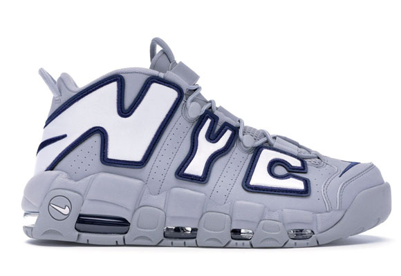 En primer lugar se encuentra la Air More Uptempo “New York”, un par idílico para todos los amantes del béisbol americano. Y es que toma sus colores de la segunda equipación de los New York Yankees, el equipo por excelencia de la MLB (Major League Baseball). El gris es el color protagonista en el diseño, que se mezcla a la perfección con el tono azul marino del swoosh y con el blanco de las letras. Éstas crean las siglas NYC, de New York City.