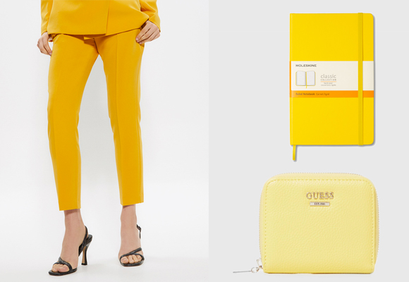 El color amarillo es claro y luminoso, por lo que se le asocia con el sol. También está relacionado con la felicidad, la alegría, el optimismo… así como con la diversión o la creatividad. Sin duda un tono para lucir sin pudor cuando suban las temperaturas con uno de los cortes de la temporada, el pantalón de traje liso, estupendo para combinar con una chaqueta del mismo color o tonos negros o grises. ¿Y para el día a día? Nada mejor que tener a mano elementos amarillos que te contagien de su luminosidad como una cartera pequeña, ideal para los bolsos pequeños más veraniegos, o una libreta Moleskine indispensable para que no se te olvide nada.