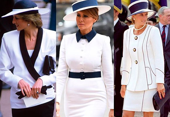 Si bien es cierto que ese estilo recuerda mucho a los diseños de Coco Chanel, los británicos han visto en Melania una clara referencia a la fallecida Lady Di, quien optaba en numerosas ocasiones por looks de estilo navy. En concreto, lució un traje muy parecido al escogido por Melania.