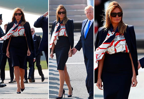 Si en la visita el año pasado Melania lució un vestido de la firma de Victoria Bekcham, en esta ocasión ha decidido apostar por grandes firmas de moda de alta costura. En su llegada al aeropuerto pudimos ver a la primera dama luciendo un traje de chaqueta azul marino con falda lápiz, y una blusa con una lazada y estampado tipo pañuelo de Gucci. Un look muy a la moda, elegante, formal y con cierto parecido a los outfits típicos de oficina.