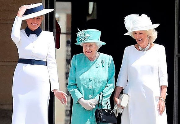 Tras aterrizar en Londres, Donald Trump y Melania fueron en helicóptero hasta el Palacio de Buckingham, donde fueron recibidos por el Príncipe Carlos de Inglaterra, su mujer, Camilla y la Reina Isabel II, que ejerció de anfitriona en una comida privada. Para el recibimiento, Melania optó por cambiar su atuendo y escogió un look clásico y atemporal, formado por un vestido blanco abotonado, ceñido hasta la rodilla, con detalles azul marino en el los cuellos del vestido y un cinturón que marcaba su figura.