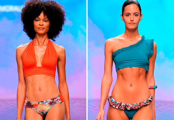 Por su parte, los bikinis son todos sin tirantes y con escote recto lo que, unido a su diseño de volantes, los hace ideales para aquellas mujeres que tienen poco pecho. También las bragas tienen volantes y ayudan a crear una figura ideal.